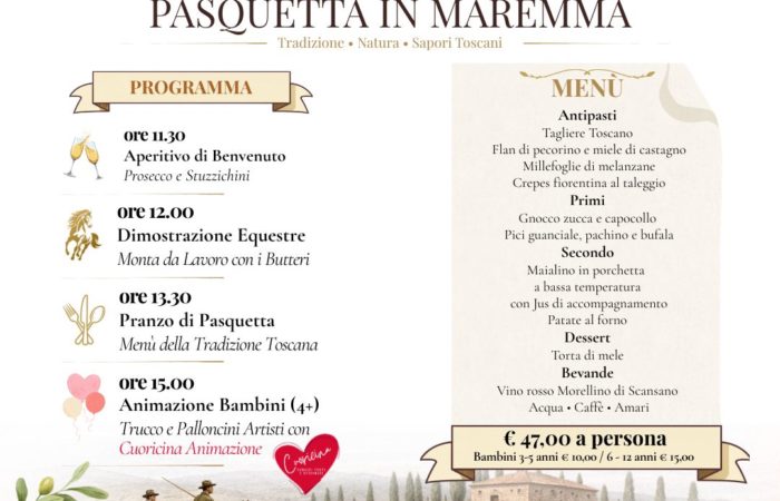Vi aspettiamo per festeggiare insieme a voi questa Pasqua 2024 in Maremma tra relax, gastronomia e divertimento. Un’opportunità per riunirsi con amici e familiari, condividendo momenti preziosi e creando ricordi indimenticabili. L’atmosfera accogliente e familiare, unita alla compagnia di persone care, alla bellezza della natura e ai deliziosi piatti aggiungeranno un tocco speciale alla vostra giornata ♥
